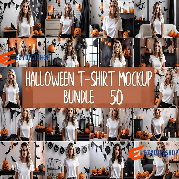 Elevate your Halloween apparel with the EZYDIGISHOP Halloween T-Shirt Mockup Bundle. This extensive collection includes 50 unique and high-quality mockups, showcasing plain white T-shirts against festive Halloween backgrounds adorned with pumpkins, bats, candles, and other spooky elements. Perfect for designers, marketers, and business owners, these mockups provide a professional and visually appealing way to present your T-shirt designs. Customize and showcase your designs effortlessly with this versatile bundle.