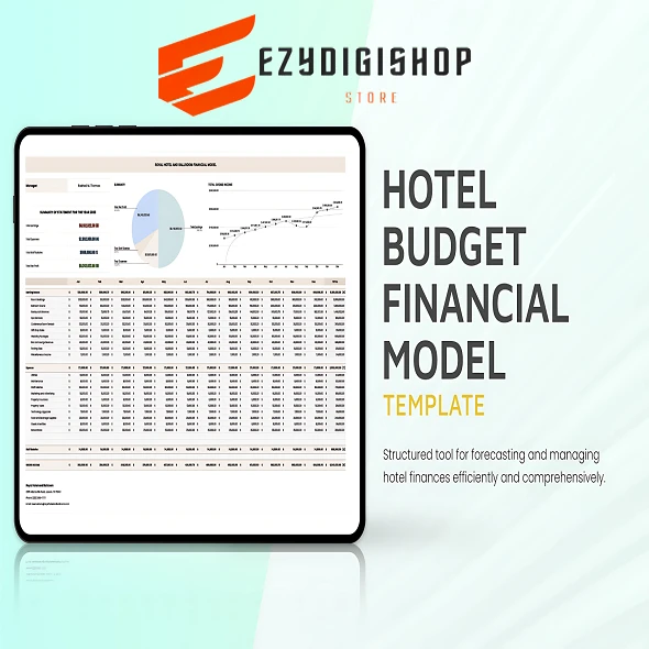 The EZYDIGISHOP Hotel Budget Financial Model Template is a meticulously crafted tool aimed at aiding hotel managers and financial planners in forecasting and managing hotel finances. This template includes detailed financial projections, budget allocations, and performance tracking features. It provides a clear visual representation of financial data through charts and tables, making it easier to analyze and make informed decisions. The template is user-friendly and customizable, ensuring it meets the specific needs of different hotel operations.