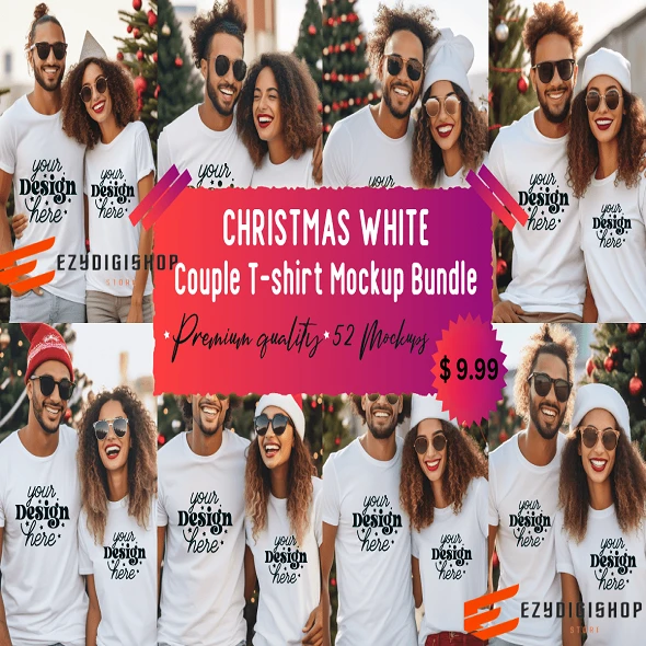 Elevate your holiday designs with the EZYDIGISHOP Christmas White Couple T-shirt Mockup Bundle. This premium quality bundle includes 52 high-resolution mockups featuring couples wearing white T-shirts, perfect for showcasing your Christmas-themed designs. Each mockup is set against a festive background with Christmas trees, creating a warm and cheerful holiday atmosphere. Ideal for designers, marketers, and business owners, this bundle allows you to present your T-shirt designs in a professional and appealing way