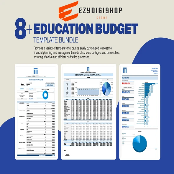 The EZYDIGISHOP Education Budget Template Bundle offers a comprehensive collection of over 8 templates designed to meet the financial planning and management needs of educational institutions. Whether you're managing the finances of a school, college, or university, these templates ensure effective and efficient budgeting processes. The bundle includes a variety of templates, such as budget summaries, detailed annual budgets, and dashboards, featuring charts and tables for easy visualization and analysis of financial data. Customize these templates to fit your specific requirements and streamline your budgeting process with ease.